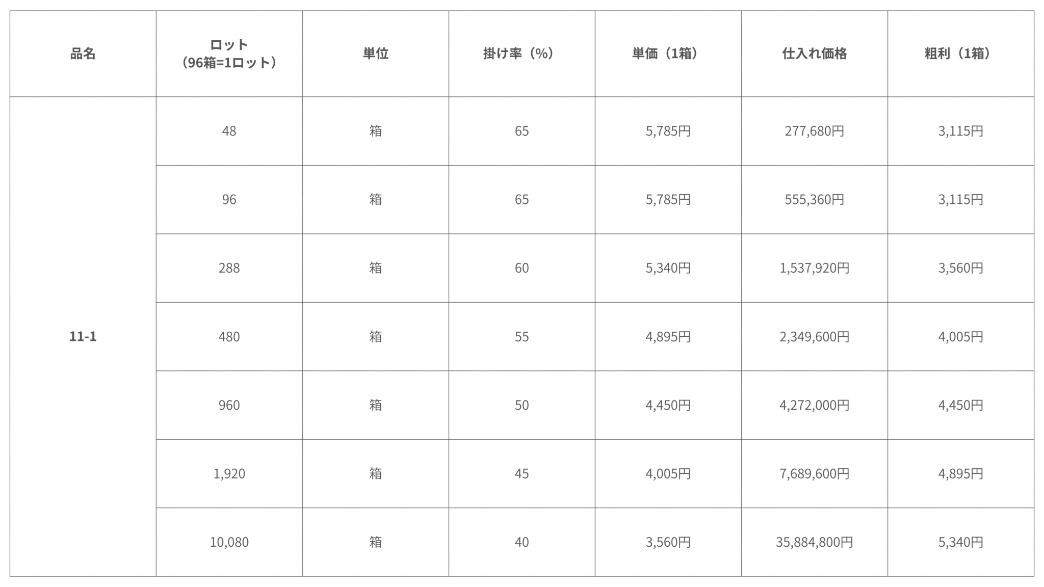 この価格がベースになり、仕入れ個数によって掛け率が変化します。