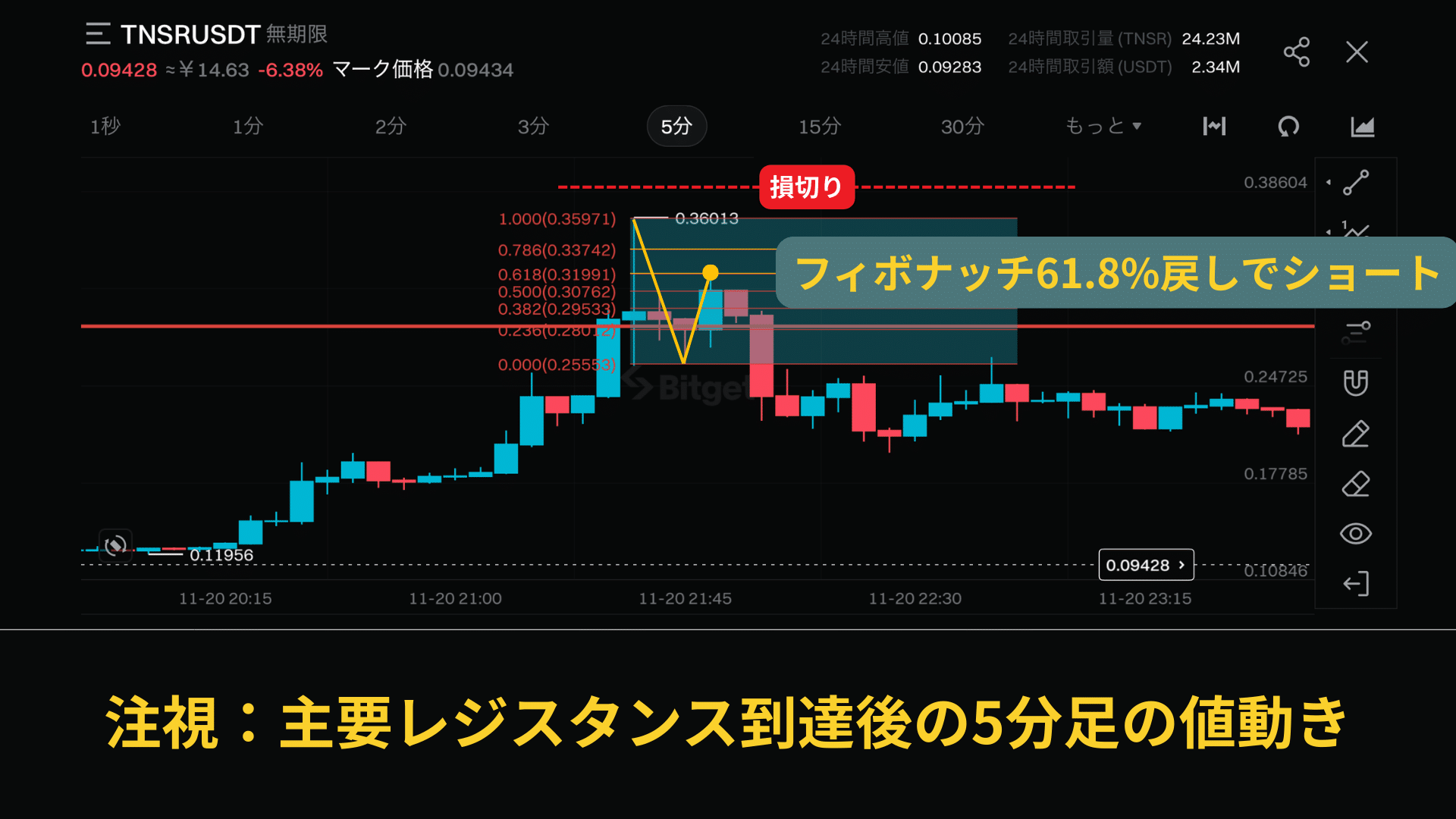 5分足で主要レジスタンスライン、戻し高値付近で反発後のフィボナッチ61.8%戻し、78.6%戻しでエントリーです。