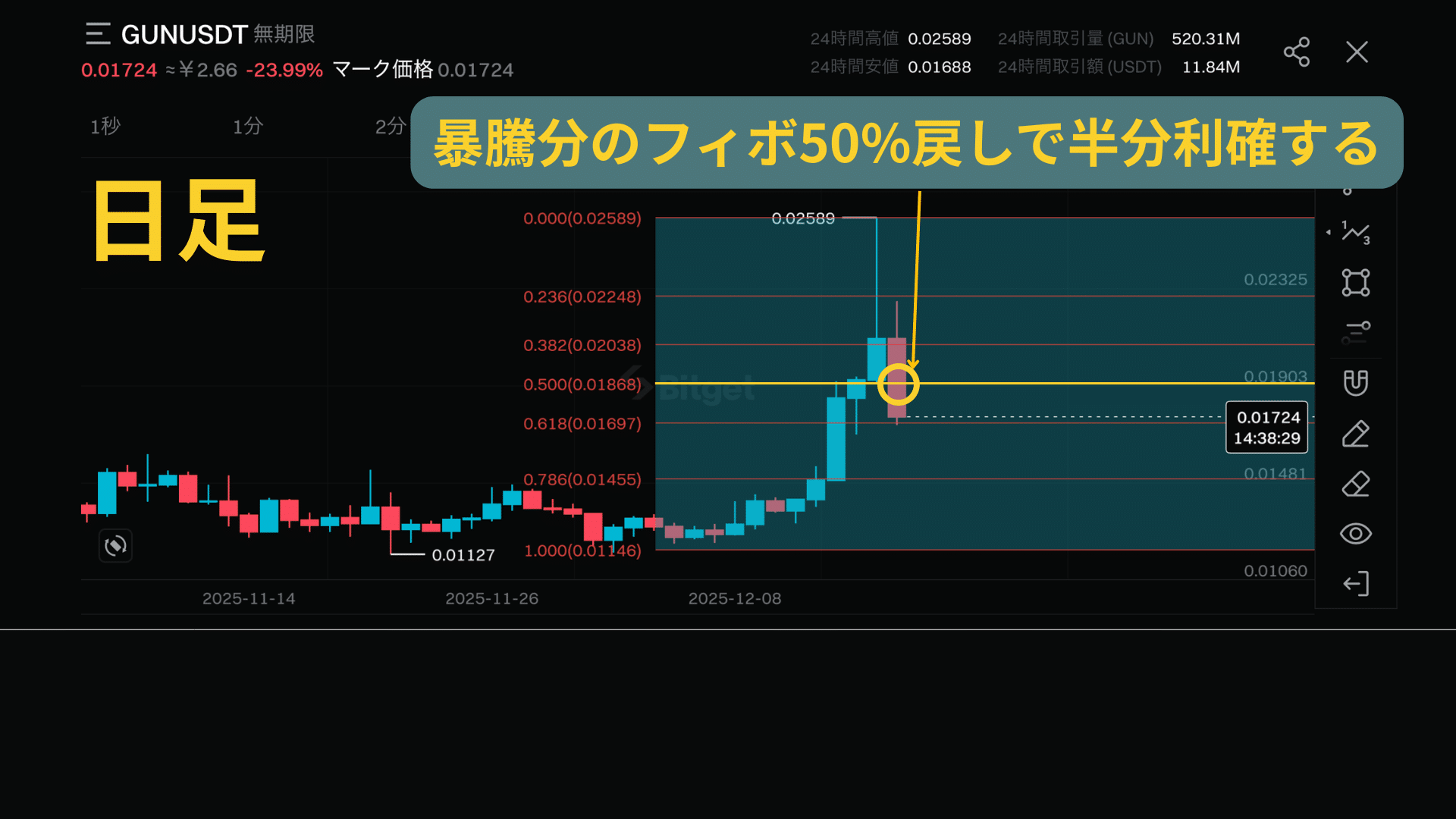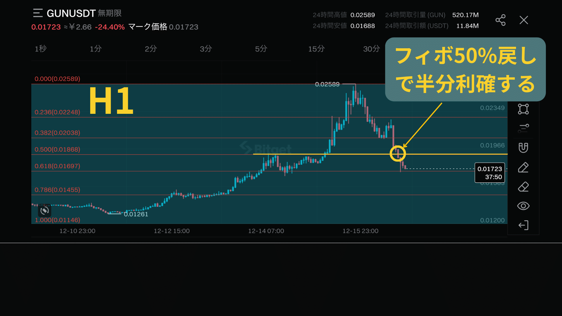もし50%手前に有効なサポートラインがあれば、そこで半分利確します。
