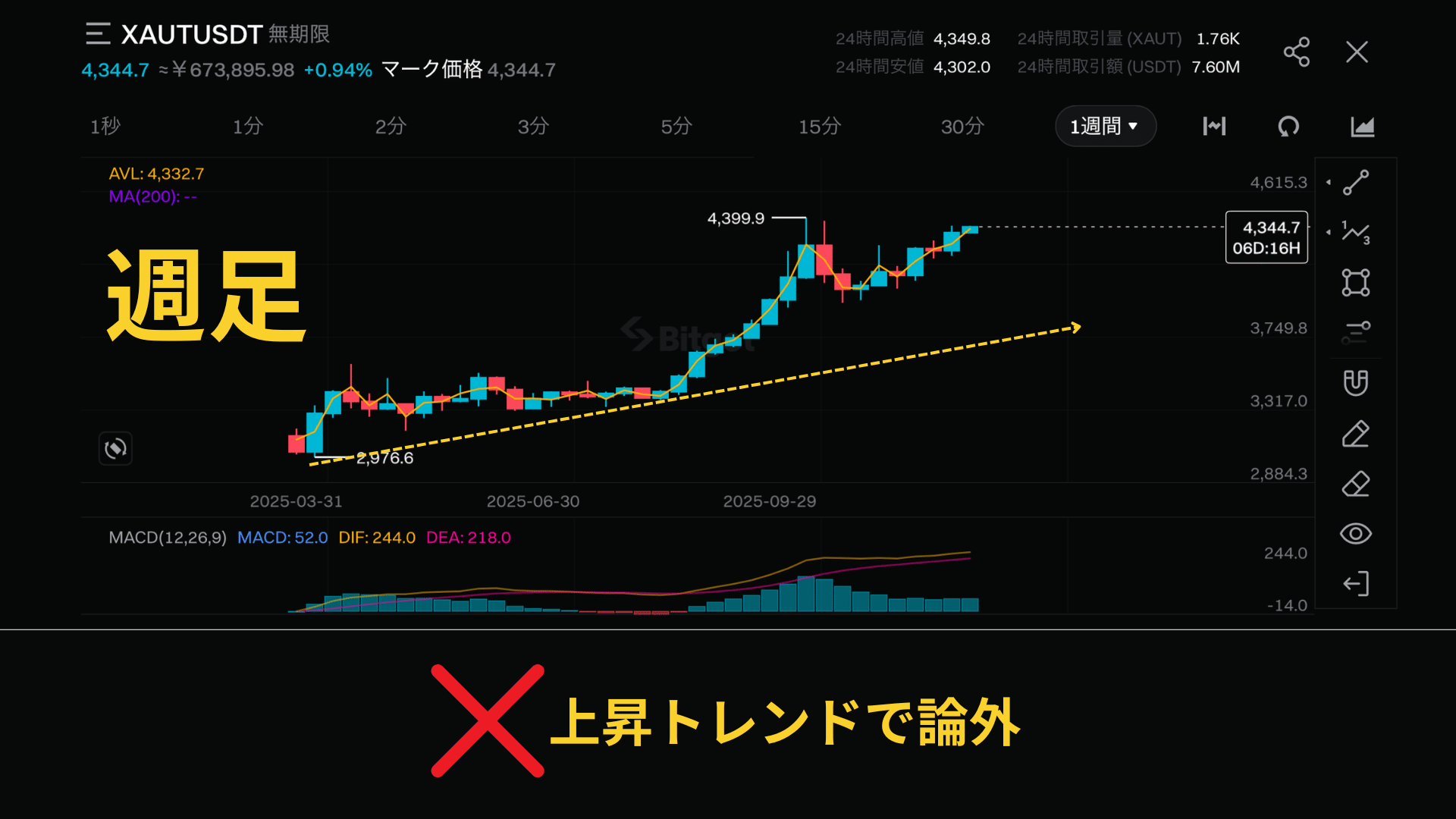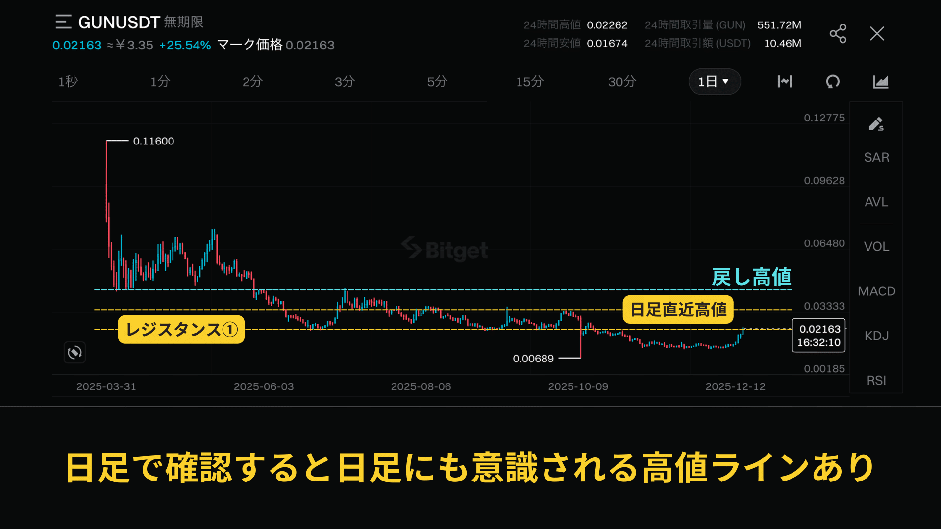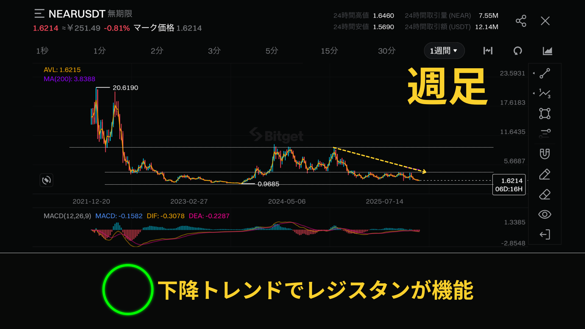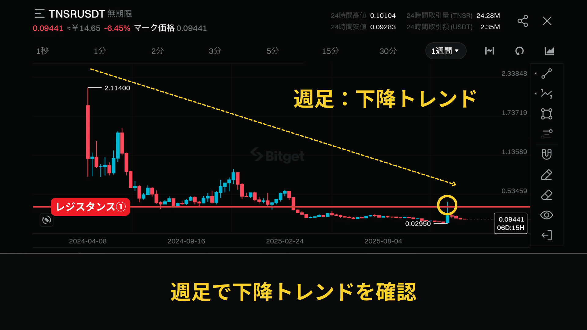 必ず週足、月足の下降トレンドを確認しましょう。たまに上昇の可能性を残しているコインもあるのでここは注意が必要です。