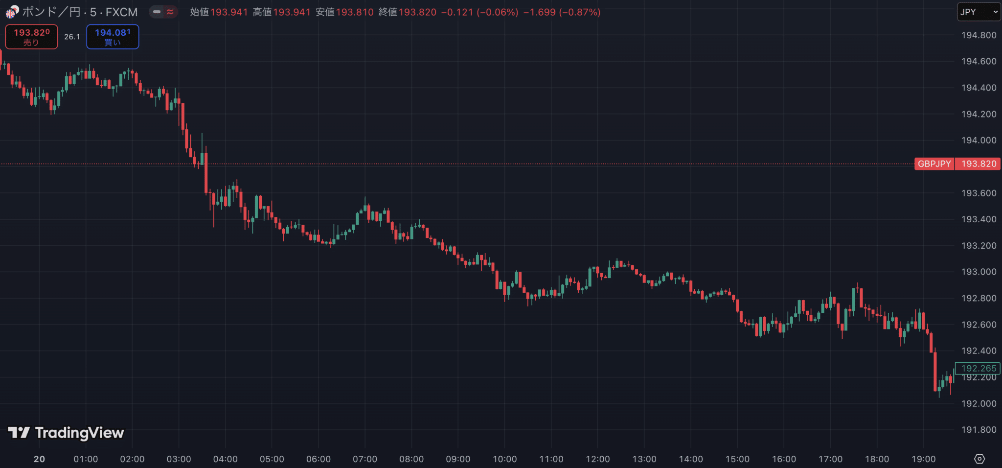 以下はGBPJPY(ポンド/円)のM5チャートですが、これを単体で見るとどうでしょうか?