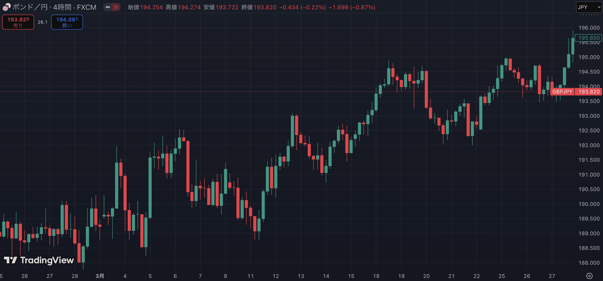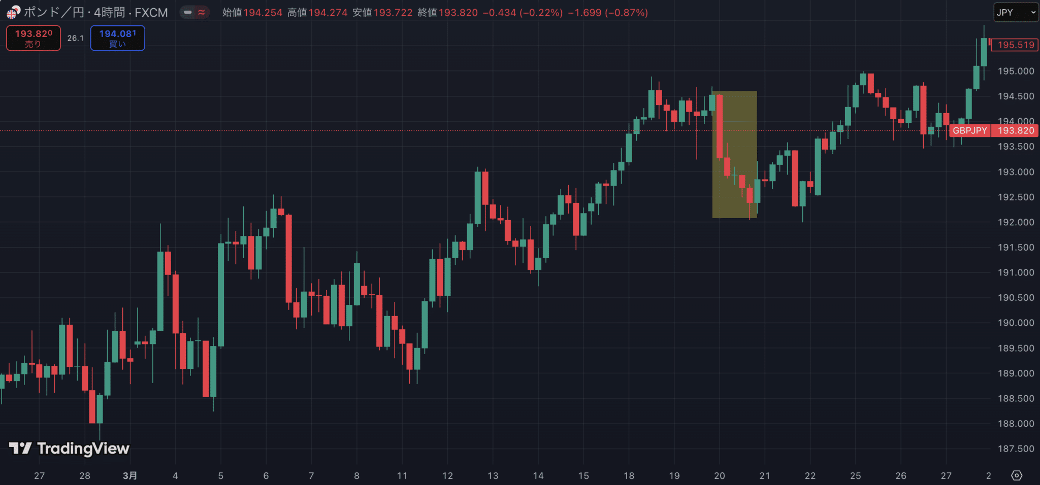 以下のチャートはGBPJPYのH4チャートです。
