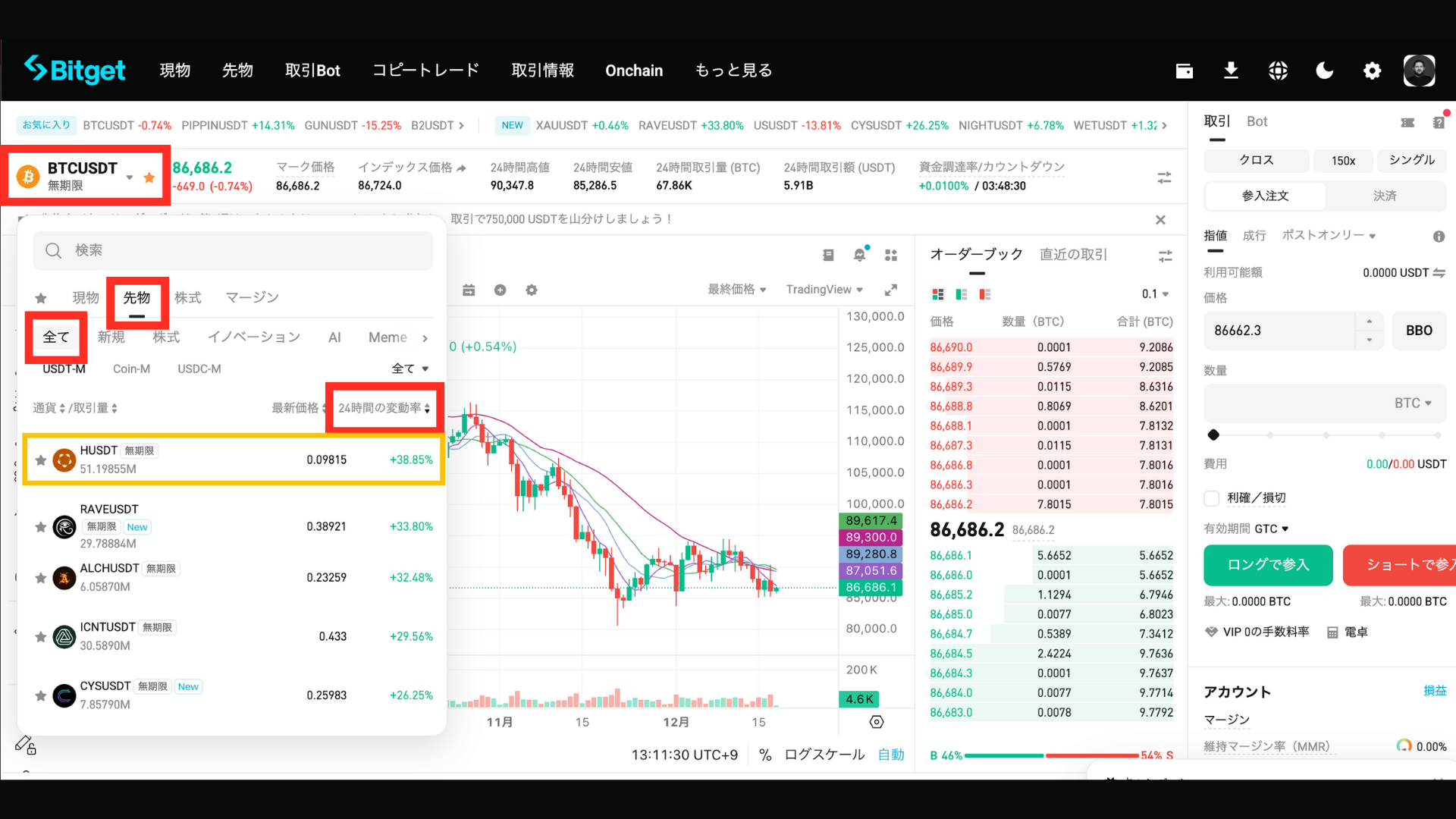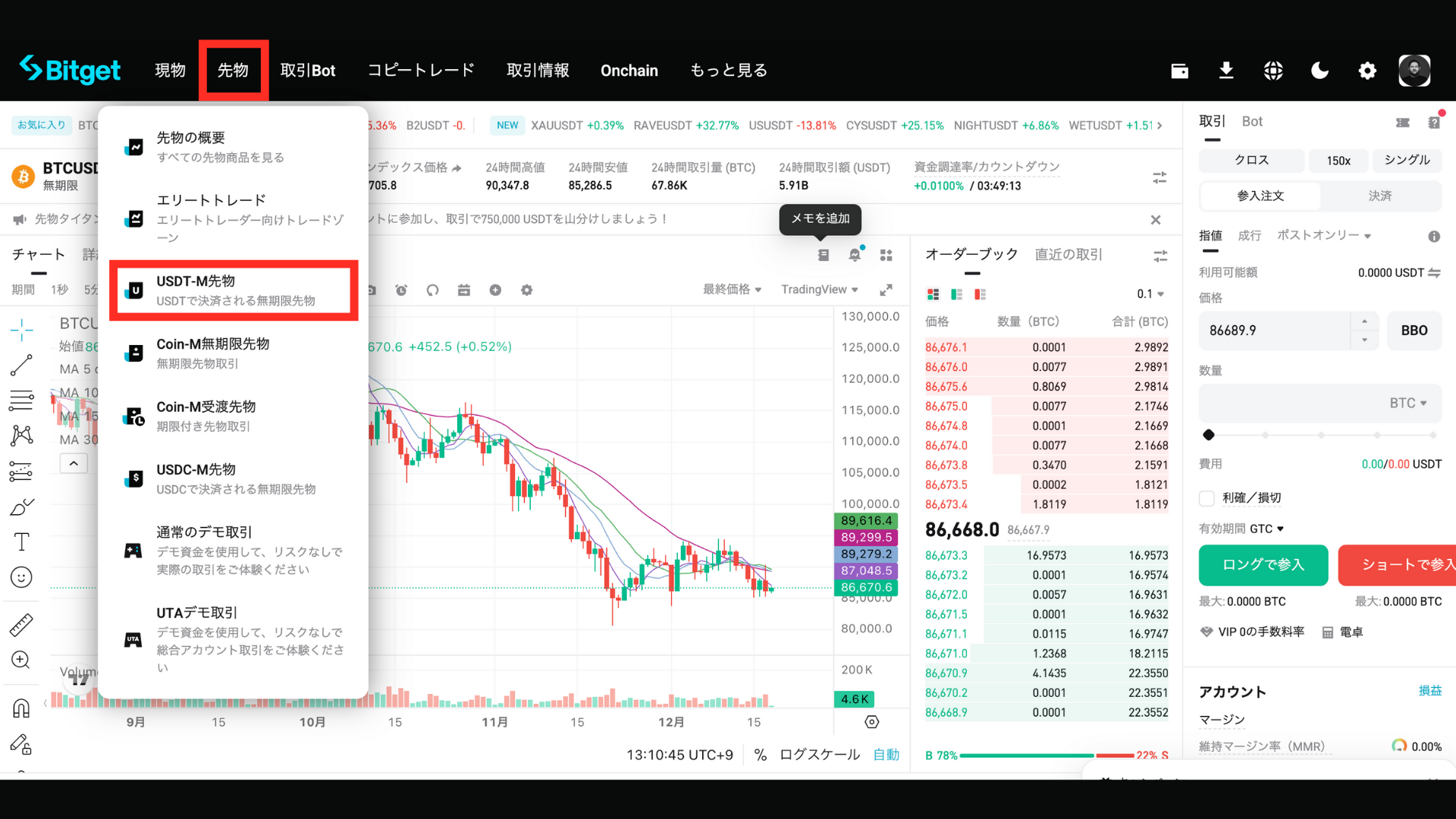 画面上部の「先物」から「USDT-M先物」を選択します。