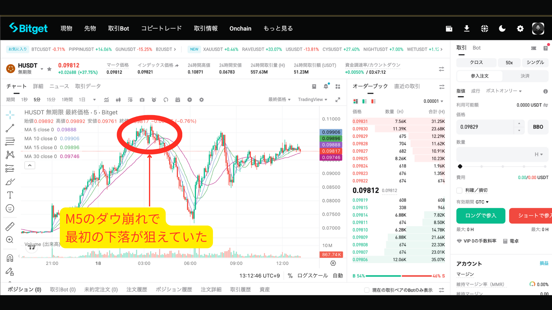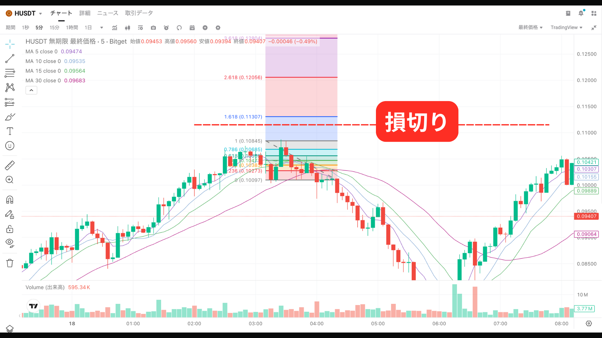 先ほどの「HUSDT」なら、損切り位置はこうなります。