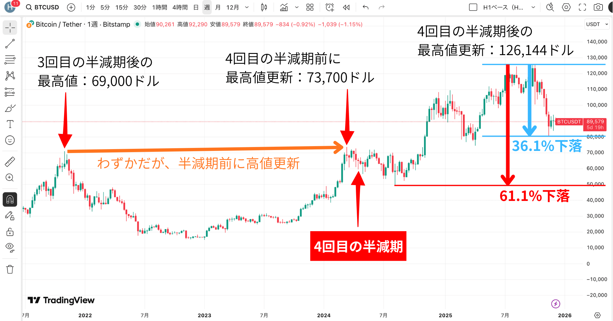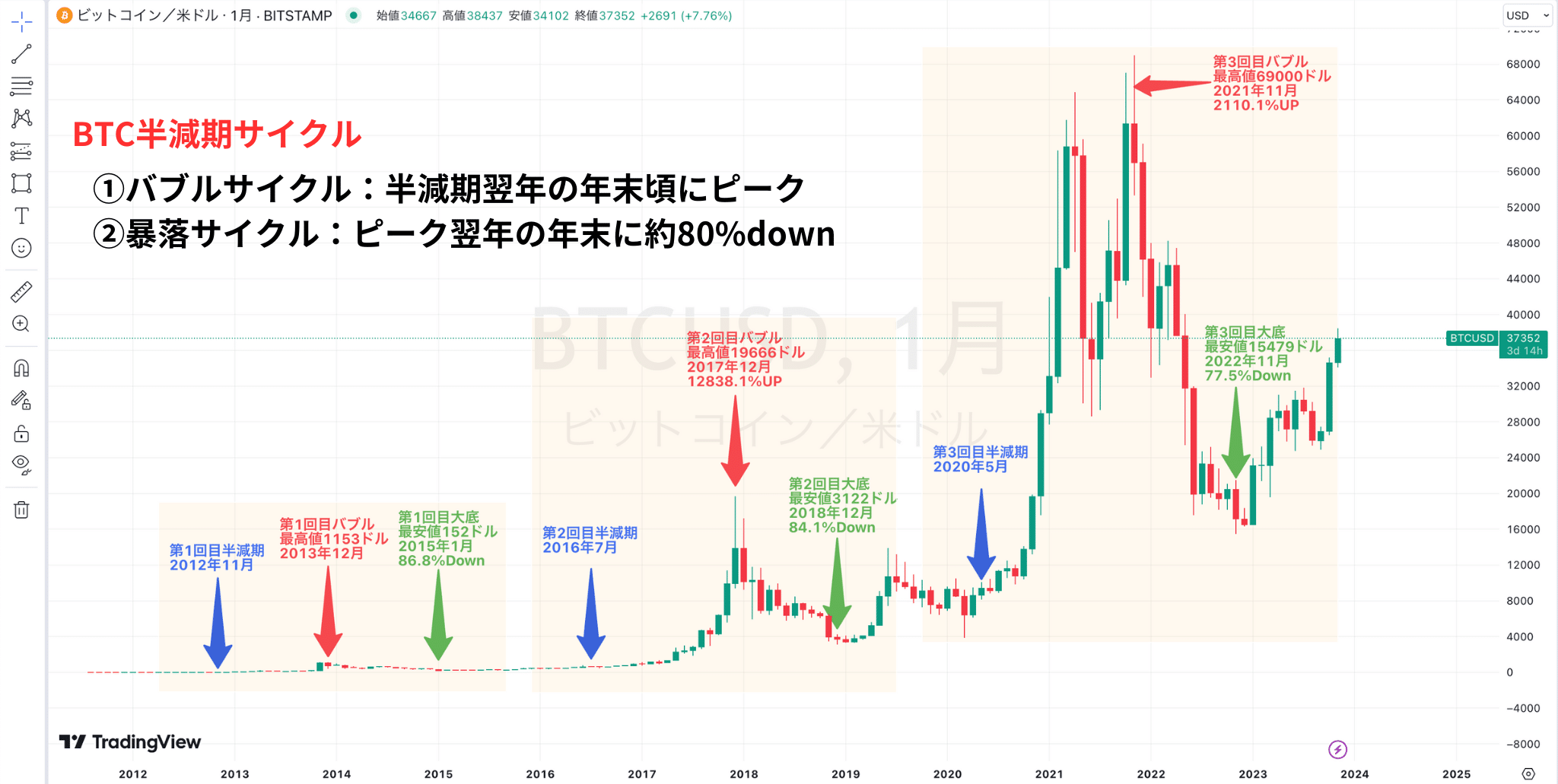 - 半減期 → 12〜18ヶ月の上昇 → 翌年12月頃に暴落 → 1年間の低迷期