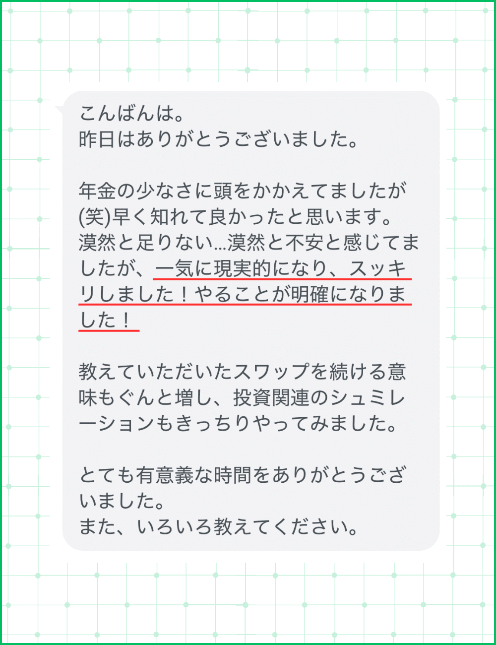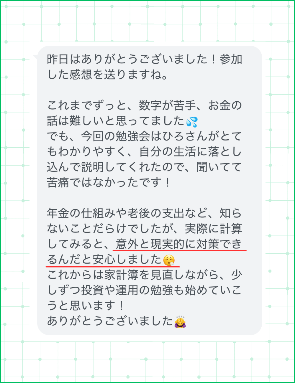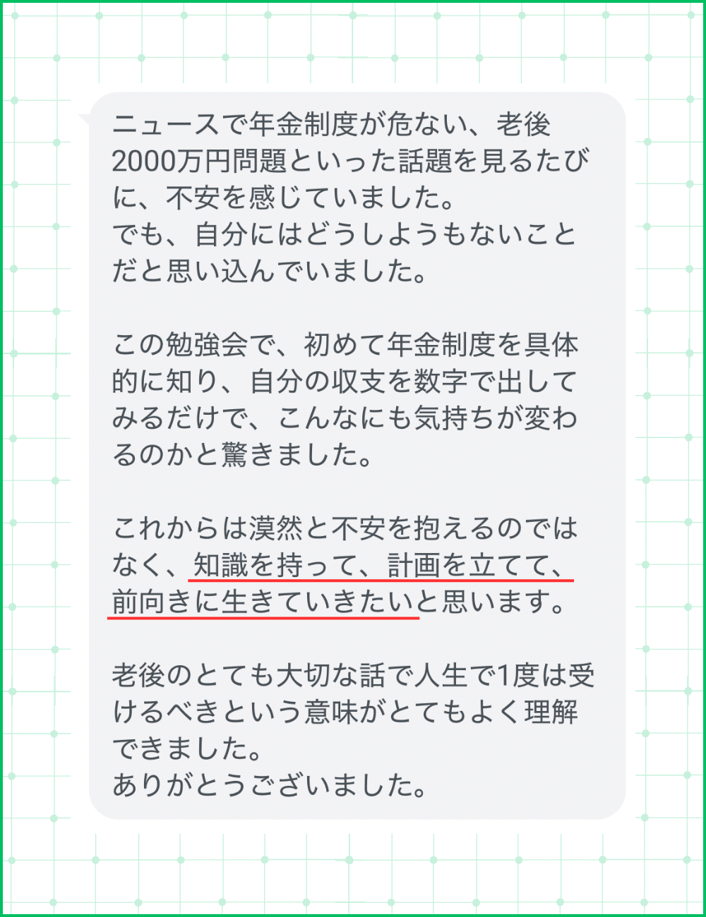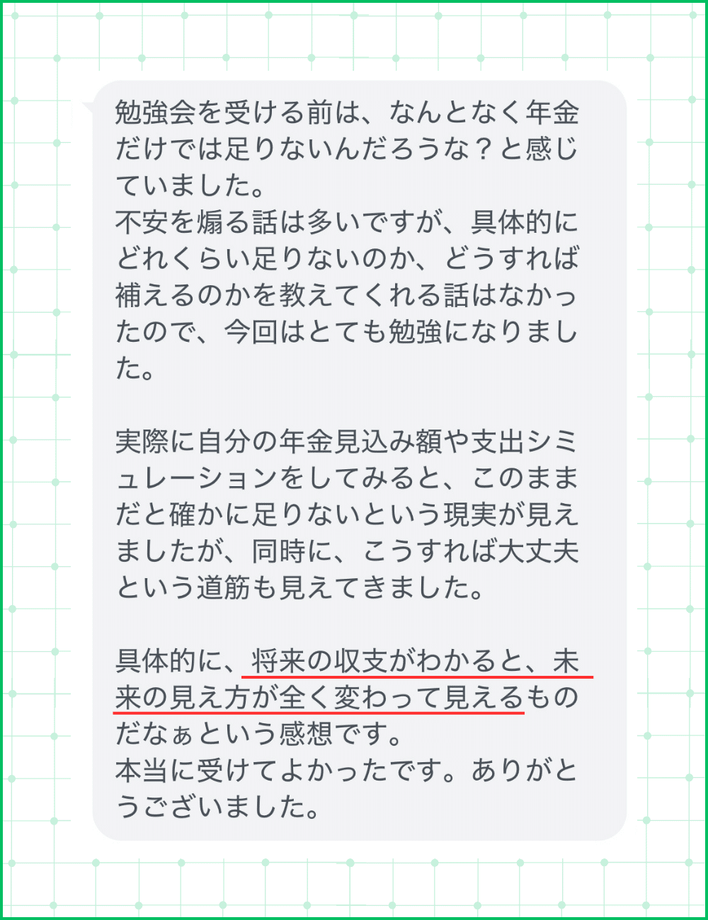 1.5時間〜2時間くらいの内容ですが、『老後の収支計算シート』を作成しながら進行するので、「長く感じなかった」というよく言われます。