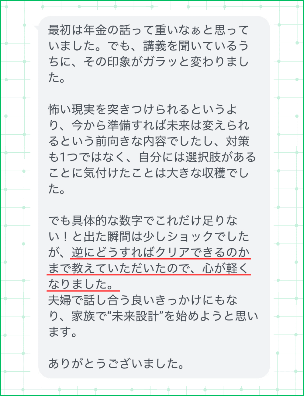 実際に参加した方も、将来にもらえる年金、出ていく支出など、実際に計算してみると驚かれる方がほとんどでしたし、対応策に関しても100%知らなかったという状況でした。