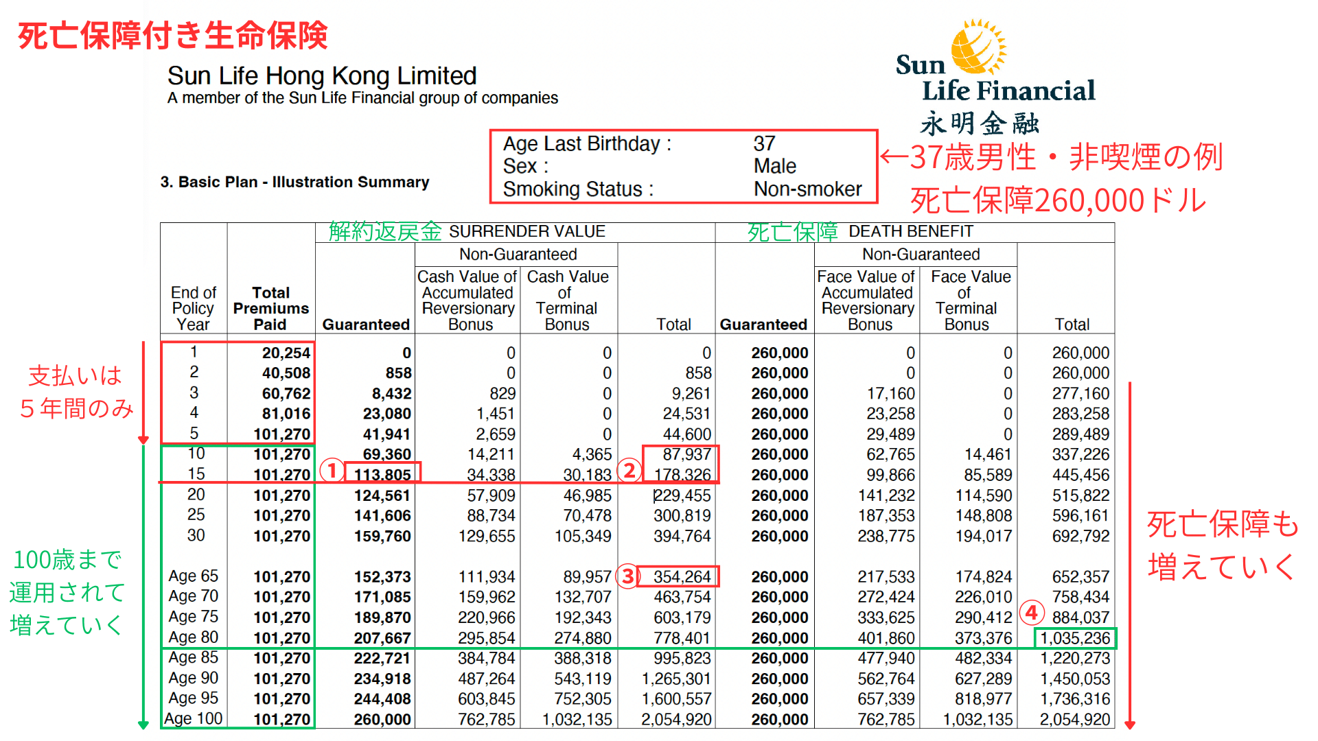 また死亡保険金は260,000ドルですが、これはスタート時点での保障額となり、死亡保障も増えていきます。